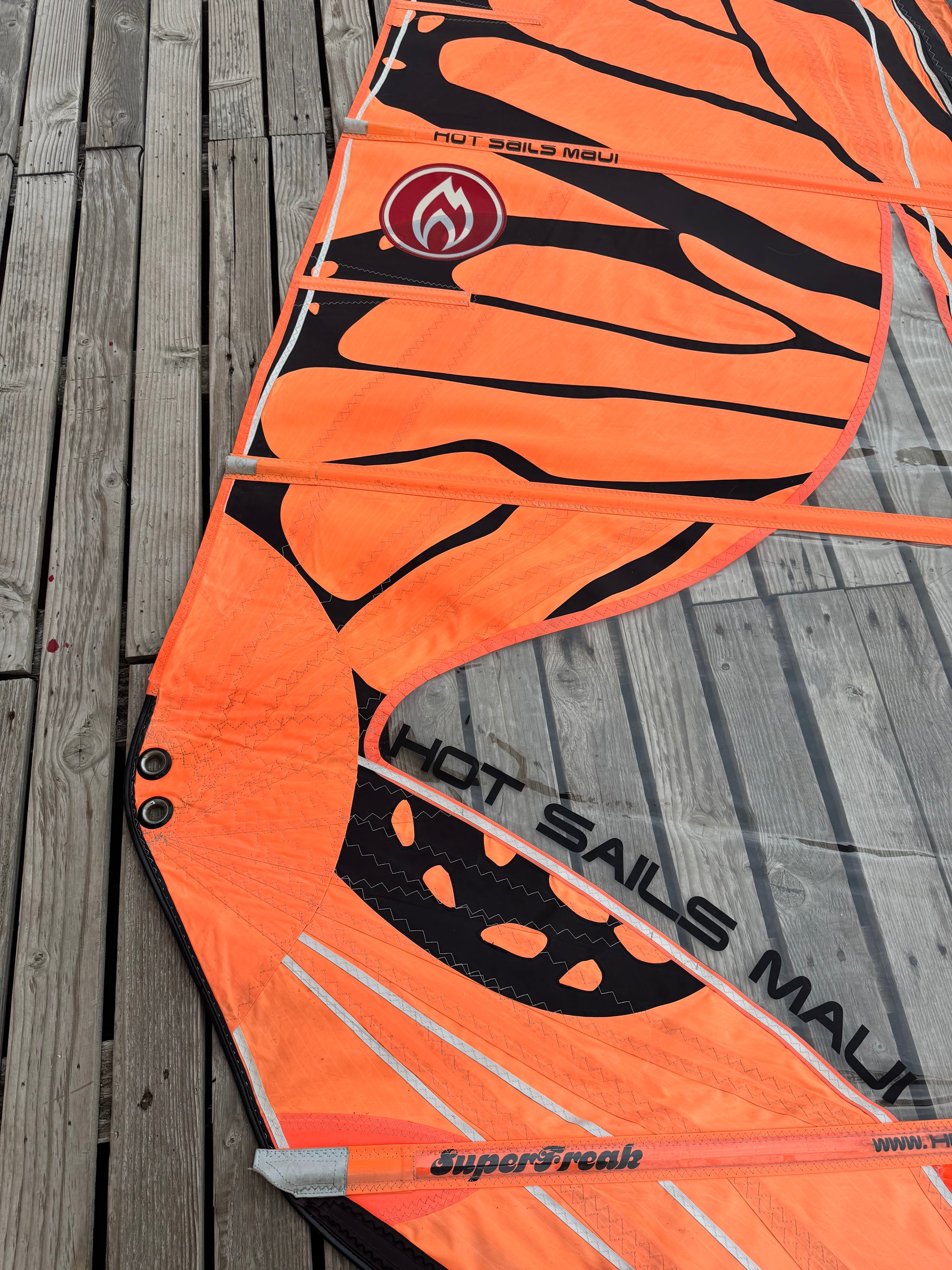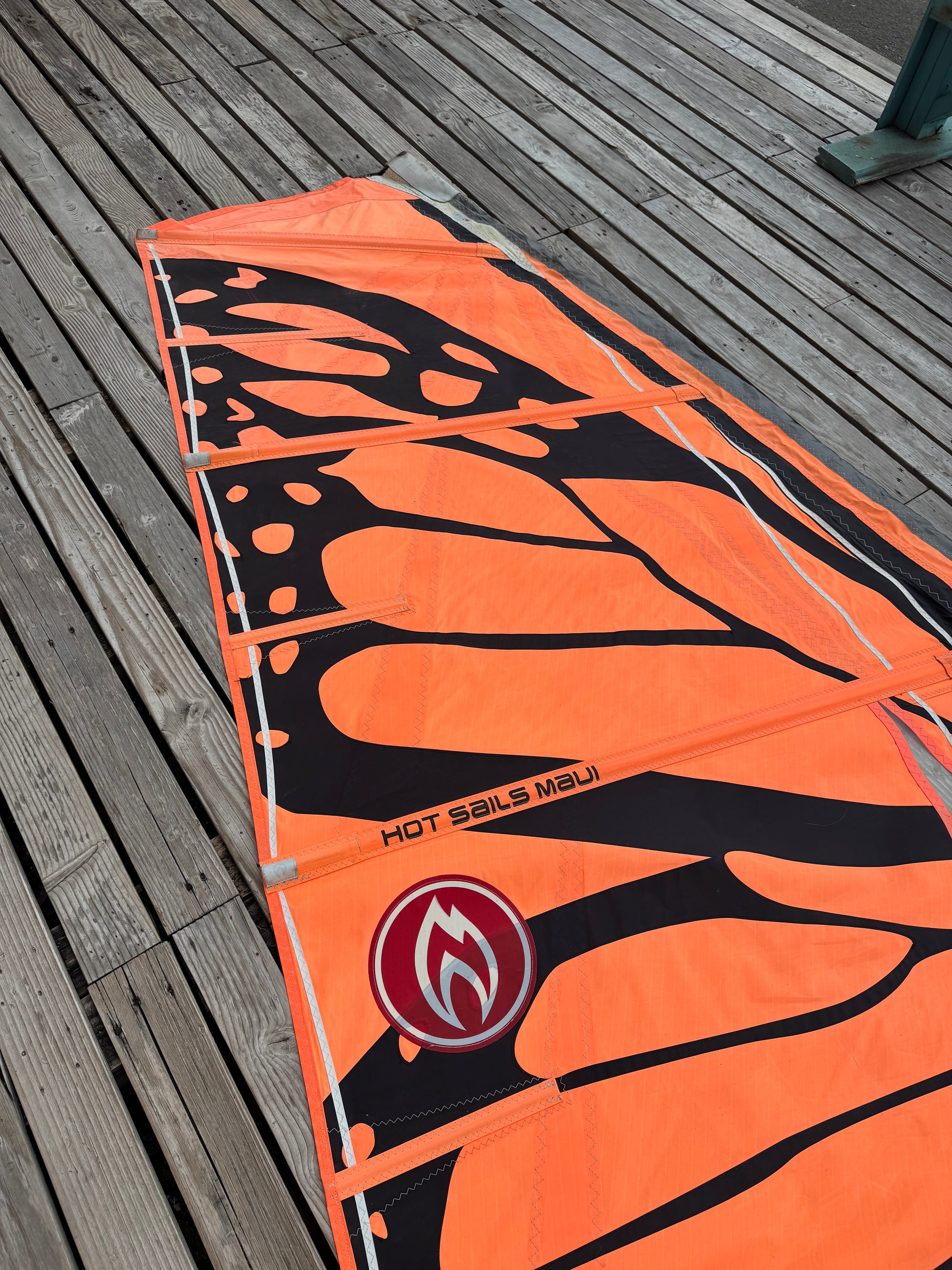 Rare Superfreak butterfly sail. Soft sail with PVC window. Great for super high winds. Rigs on a 370 mast. The middle foot panel was replaced by Hot Sails. Bottom 20% of the sail is UV-exposed.