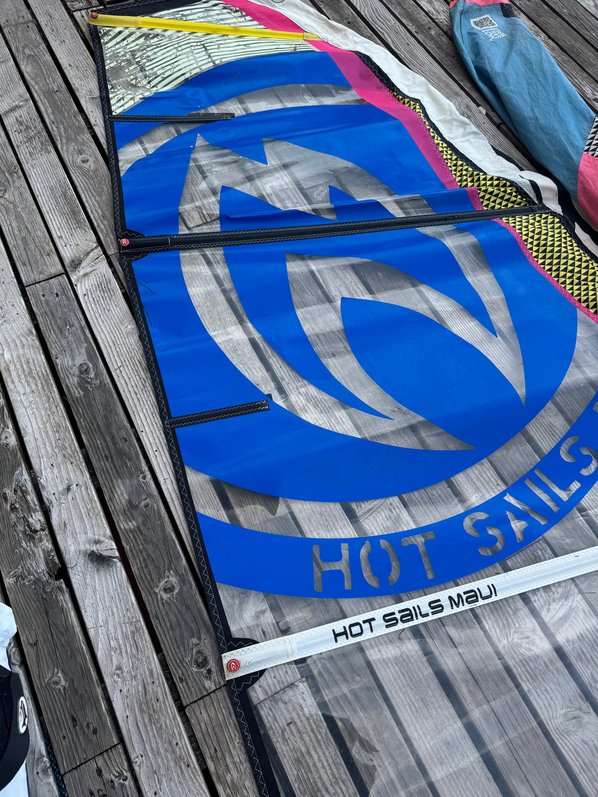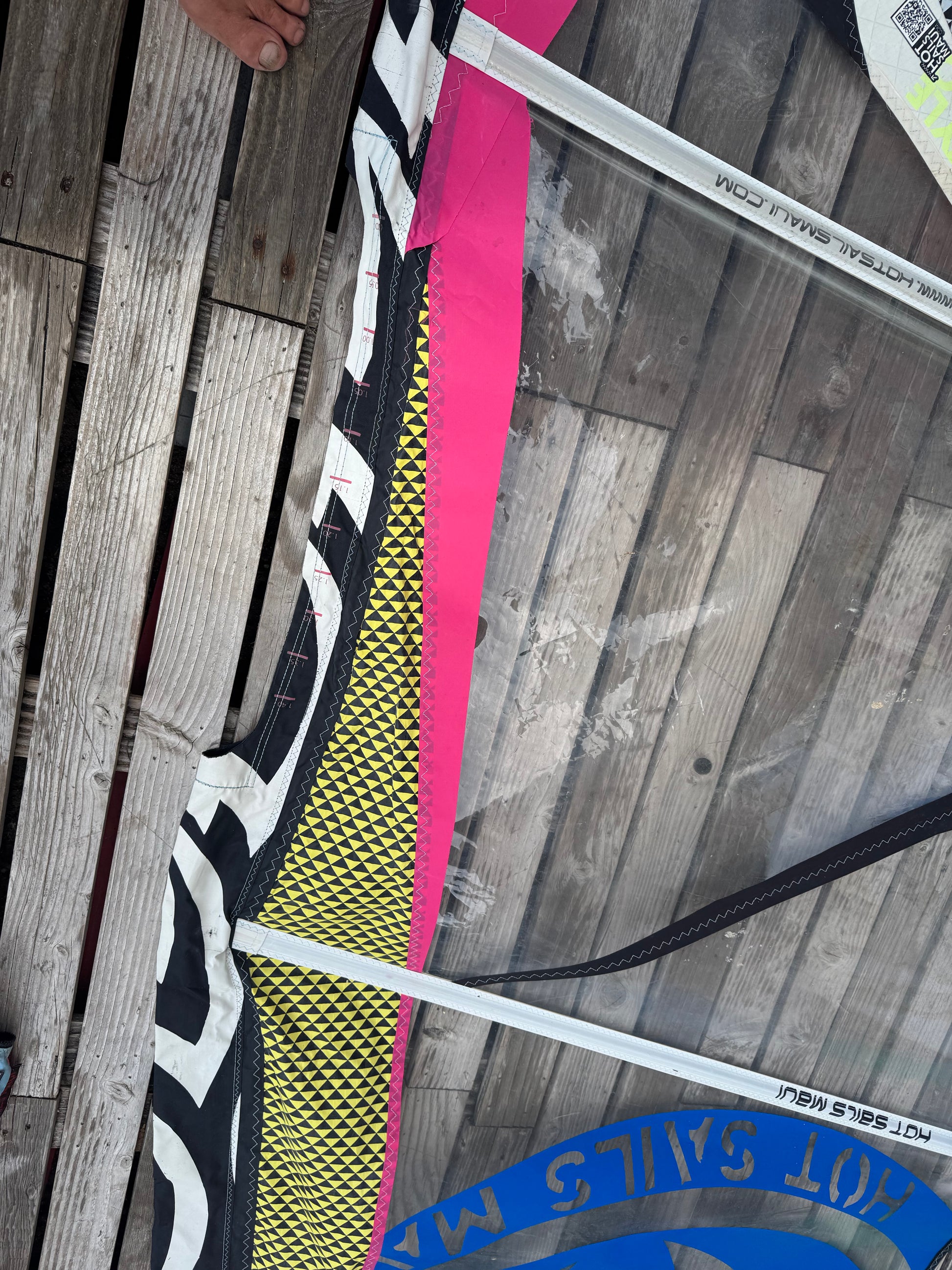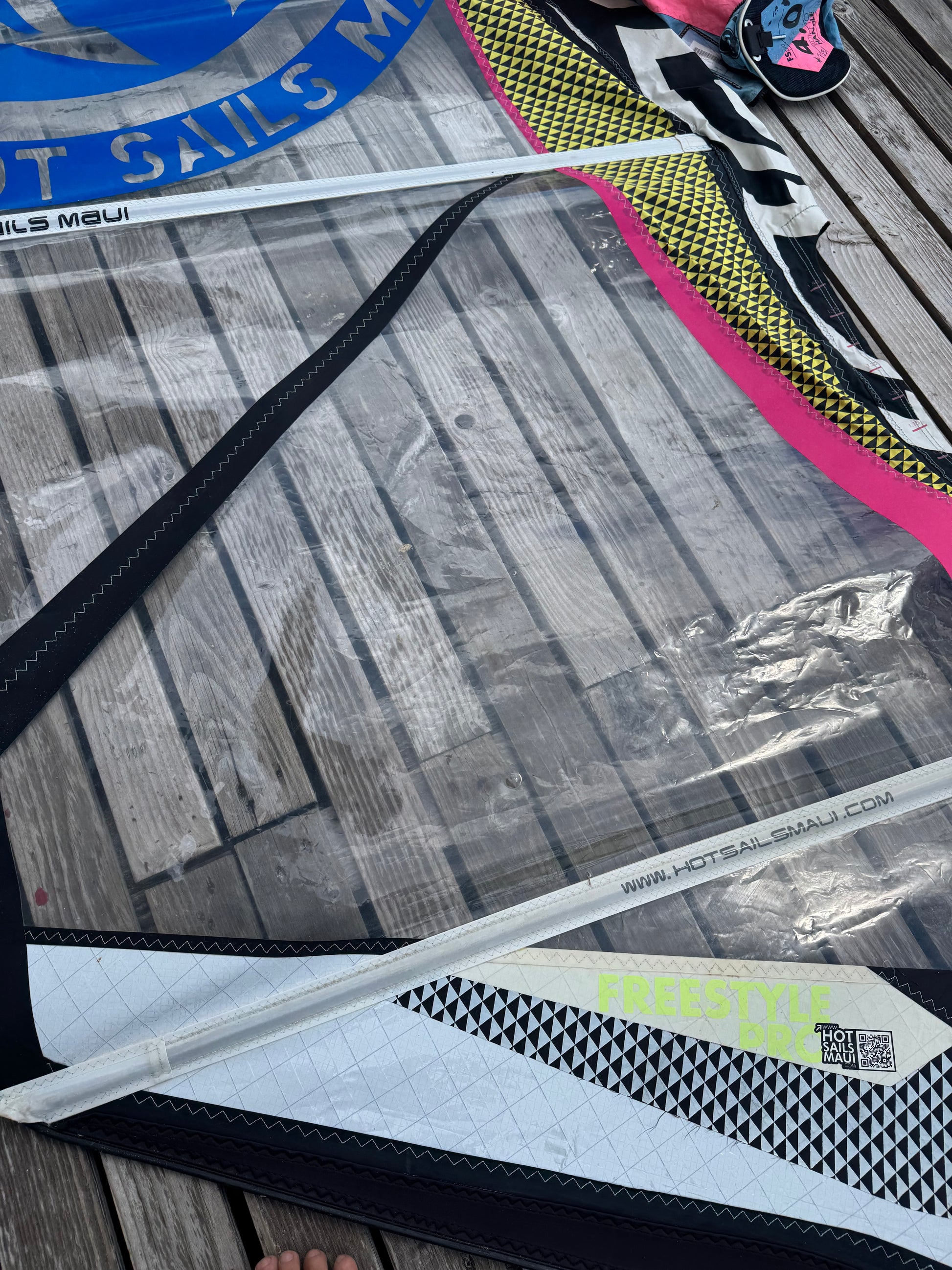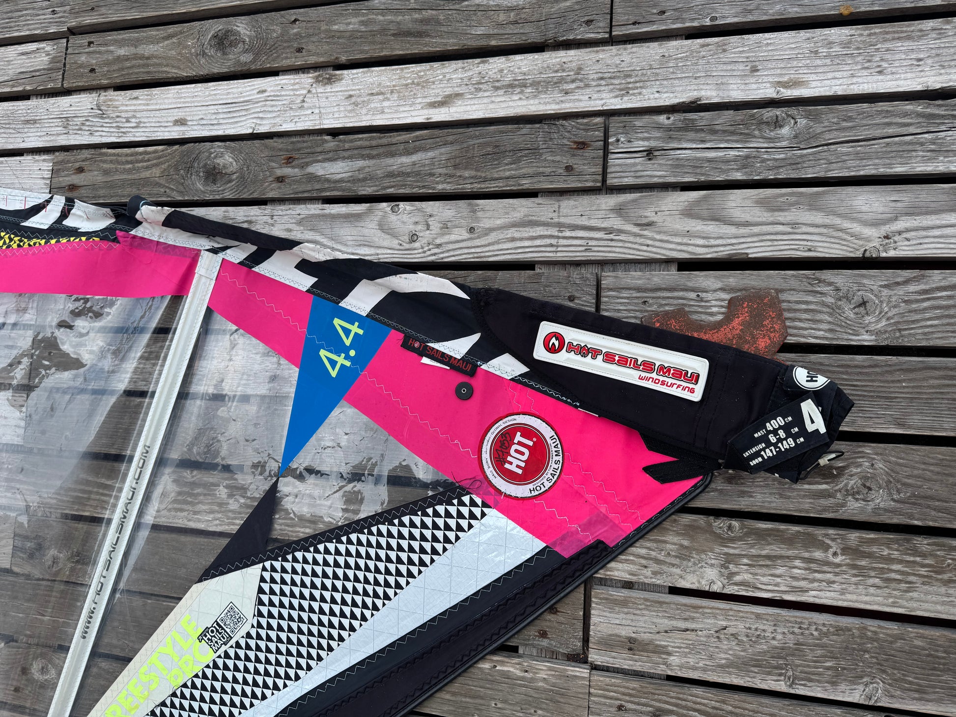 This freestyle pro 4.4 is an older pro in good condition. Is a great value at 140.00. Some wrinkling on the modified window. Some of the white xply may have slight delamination, but not a performance issue and only a very small part of the sail. Printing at top is flaking off. This sail has spent more time traveling around the world than it has windsurfing.