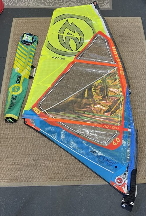 Used windsurfing sail. Rare used 4.0m KS3. Sail has seen some use and window slightly wrinkled but is very clean. No Repairs and tears.